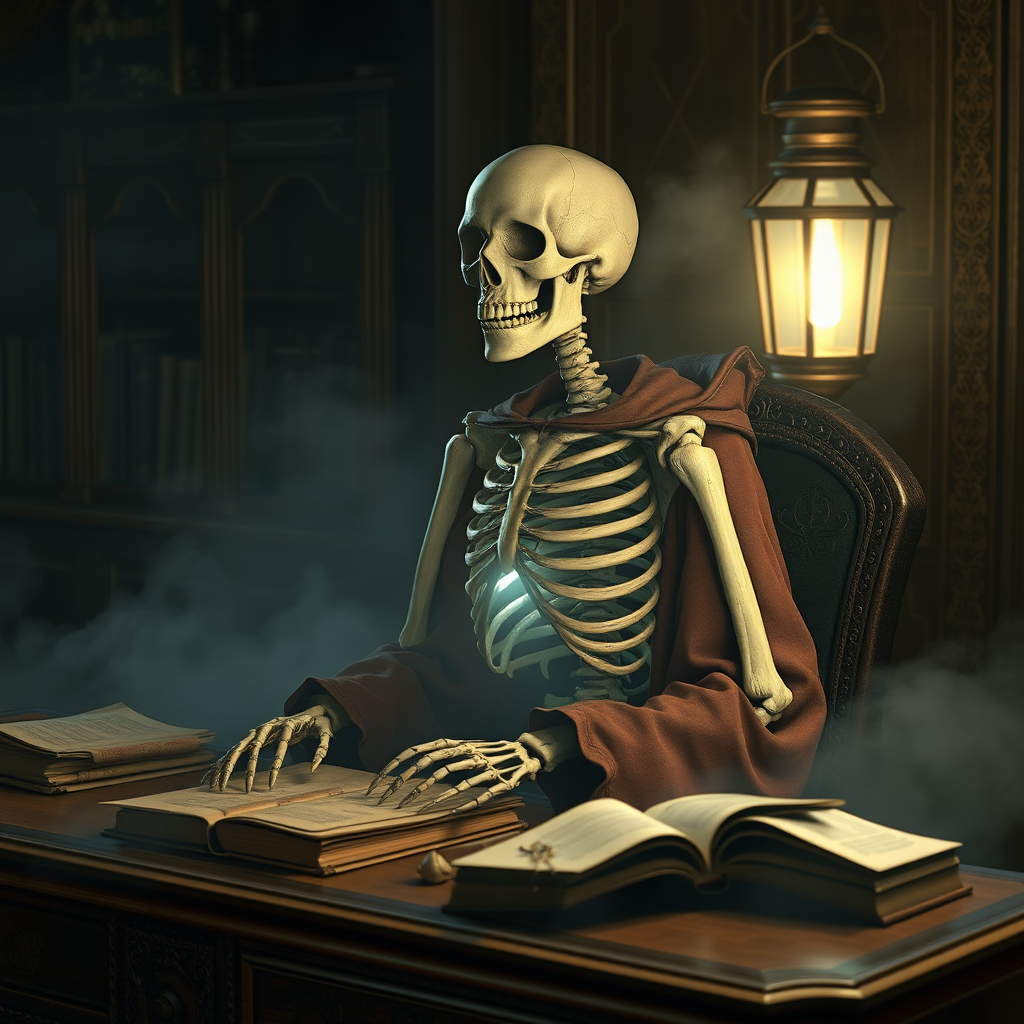 A skeletal figure seated at an ornate wooden desk, illuminated by a flickering lantern casting dancing shadows; the bones glisten with an ethereal glow under the dim light. The ambiance is akin to Eve Ventrue's style, capturing the essence of western-style portraits with a ZBrush-like hyper-realism. The scene is enveloped in a faint mist, lending a mysterious air to the atmosphere. The skeleton is adorned in intricate, detailed costumes reminiscent of witchy academia, with billowing robes and mystical patterns. An array of dusty tomes and aged parchments are scattered across the desk, suggesting a lifetime of scholarly pursuits. The setting evokes an intense close-up, revealing every carved nuance of the skeletal form and its surrounding environment.