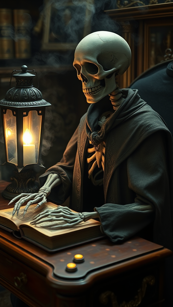 A skeletal figure sits at an ornate wooden desk, its bony fingers gently resting on an ancient tome. A lantern casts a moody glow, illuminating the delicate details of an embroidered cloak draped over its shoulders. The scene captures an ethereal quality, reminiscent of eerie western-style portraits. Mist swirls around, adding a touch of mystery to the dimly lit study. The close-up reveals intricately carved jewelry and symbols etched into the skeleton's bones, reflecting a rich history steeped in witchy academia. The atmosphere is hauntingly beautiful, merging the elegance of a bygone era with the fantastical.