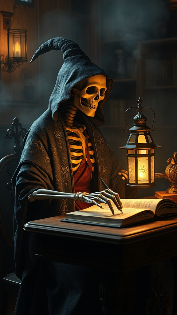 A skeletal figure sits poised at an ornate wooden desk, enveloped in the dim, flickering glow of a lantern. The setting evokes a sense of witchy academia, with intricate details woven into the character's attire—elaborate robes adorned with arcane symbols and textures reminiscent of western-style portraits. Mist swirls around the scene, adding an ethereal quality. The skeleton displays a contemplative demeanor, with its bony fingers brushing over ancient tomes and a quill poised for thought. The atmosphere is rich with detail, capturing the haunting beauty of an intense close-up, reminiscent of zbrush artistry, while shadows dance across the walls, casting an aura of mystery and timeless curiosity.