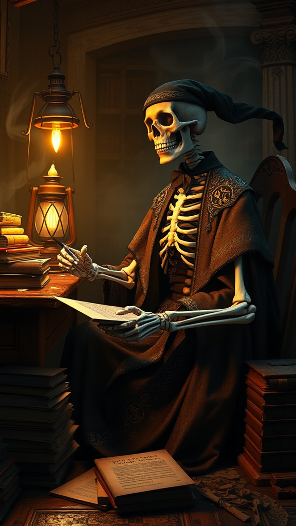 A skeleton seated at an ancient oak desk, bathed in the warm glow of a flickering lantern, surrounded by piles of dusty tomes and scattered parchments. The scene captures a western-style portrait essence, infused with a mystical, witchy academia atmosphere. The skeleton wears an elaborate, intricately detailed robe adorned with arcane symbols, its bony fingers delicately holding a quill poised over a parchment. The background shrouded in swirling mist, adding an ethereal quality to the composition. The artwork draws heavily from Eve Ventrue's style with close-up views of the skeleton’s ornate costume, the texture of its bones, and the dimly lit, enigmatic expressions. ZBrush-inspired detailing enhances the depth and realism, while the setting evokes an aura of scholarly mystery and age-old secrets.