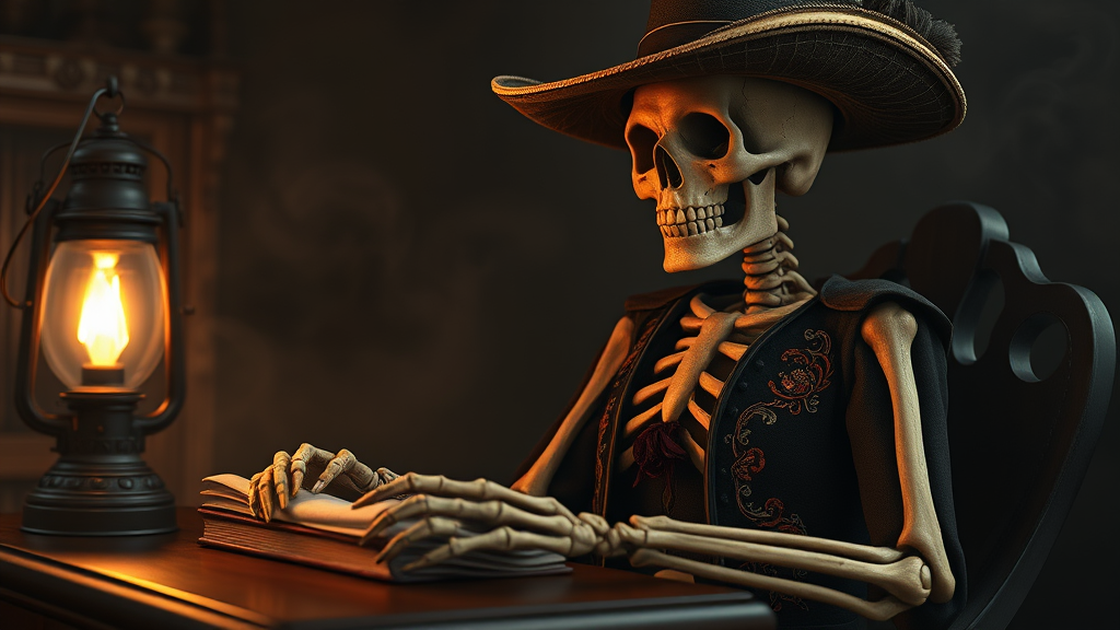 A skeleton seated at an antique wooden desk adorned with a flickering lantern, bathed in an ethereal glow. The scene captures the moody atmosphere of witchy academia, with a backdrop of swirling mist. The skeleton is adorned in a richly detailed, Western-style costume, featuring intricate embroidery and a wide-brimmed hat. Its bony fingers rest on ancient tomes and scrolls, hinting at a lifetime of arcane study. The intimate, intense close-up reveals the texture of aged bones and the gleam of the lantern, casting dramatic shadows. The style is reminiscent of Eve Ventrue, masterfully blending digital artistry with the classic allure of ZBrush, creating a portrait that is both haunting and captivating in its mysterious elegance.