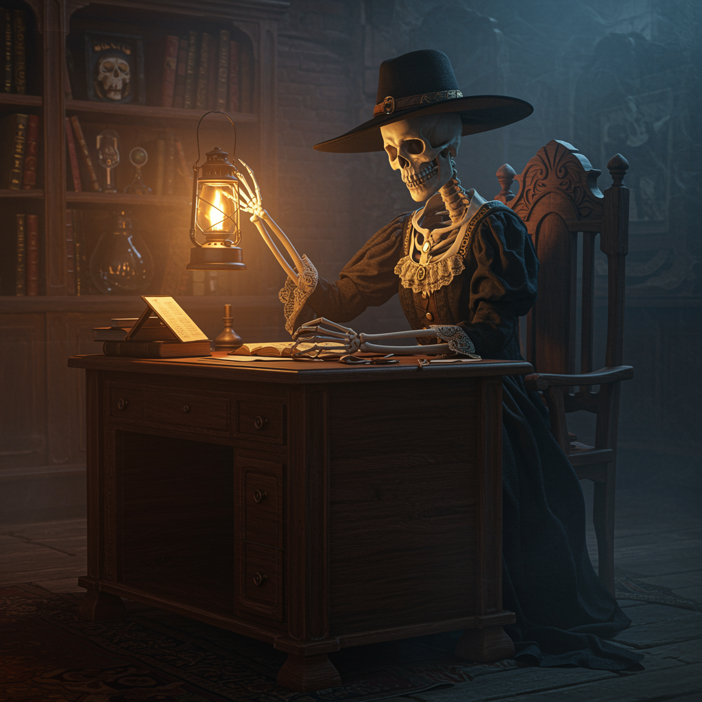 A skeleton seated at an antique wooden desk, illuminated by the flickering light of an old lantern, in a style reminiscent of Eve Ventrue. The setting evokes western-style portraits, capturing an intense close-up with intricate detailing. Mist swirls softly around, enhancing the atmosphere of mystery. The skeleton is adorned in finely detailed, witchy academia attire, with elements like ornate lace, velvet textures, and mystical symbols. The scene is meticulously sculpted, resembling a ZBrush creation, blending realism with fantasy. The backdrop subtly hints at a library filled with arcane books and curiosities, adding depth to the scene.