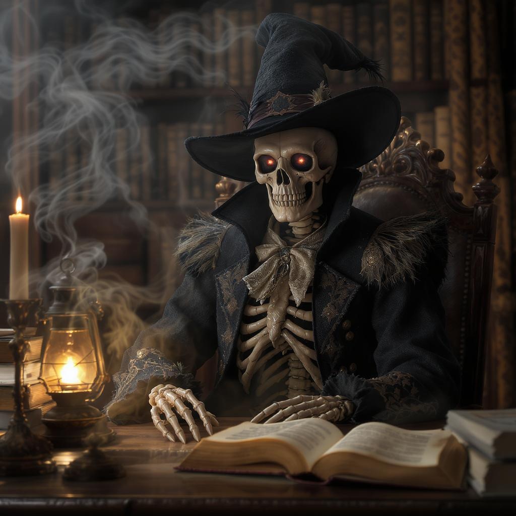 A skeleton seated at an ornate wooden desk, illuminated by the soft glow of a lantern, wearing an intricately detailed, Victorian-inspired outfit that evokes witchy academia. The scene captures the atmosphere of mystery and knowledge, with mist subtly swirling around, creating an ethereal aura. The setting is reminiscent of a Western-style portrait, with an intense close-up that highlights the textures of the costume and the intricate design of the bones. There's a blend of zbrush detail that emphasizes the skeletal structure, combining elegance with a hint of the macabre.