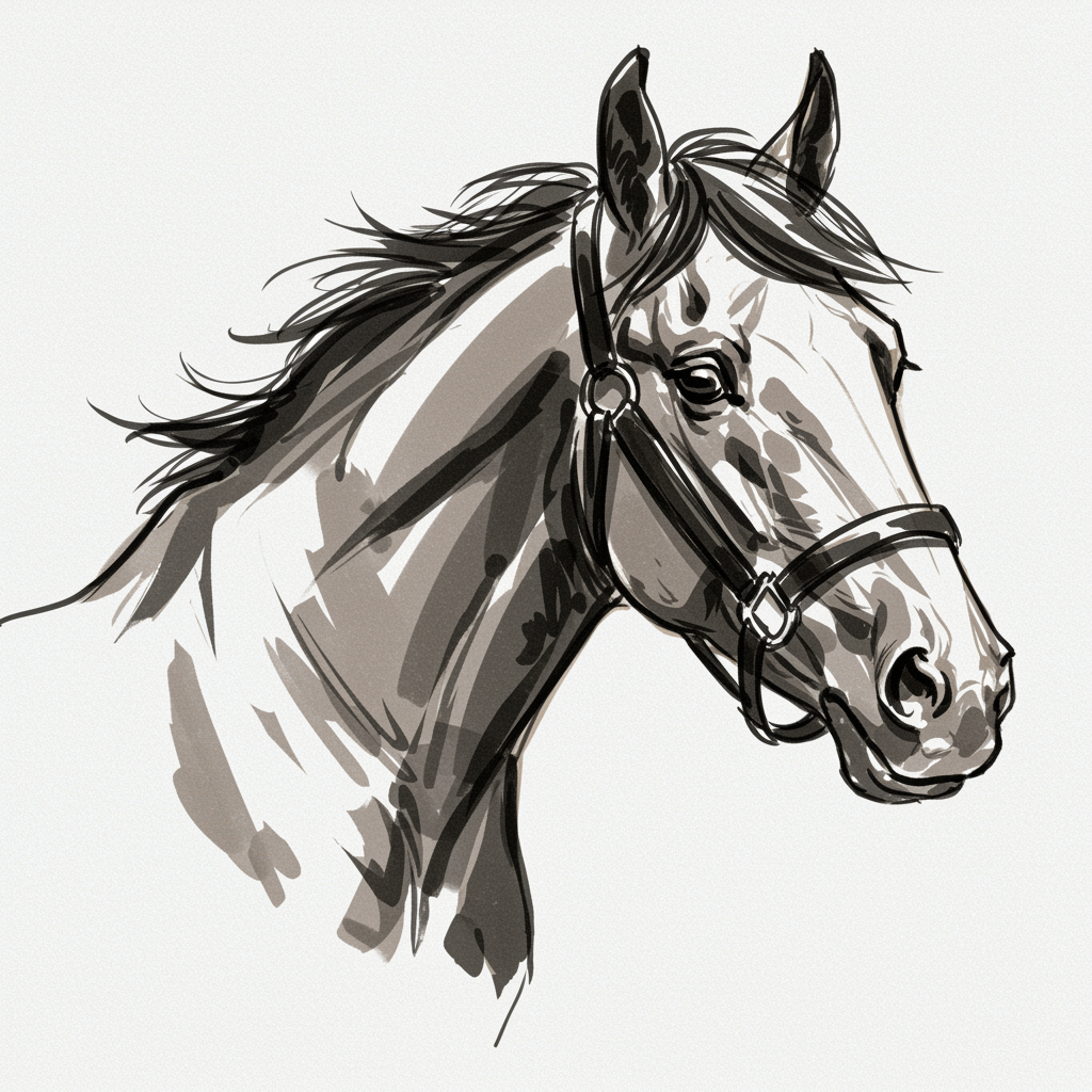 A sketch of a horse, featuring bold, sweeping strokes, capturing expressive facial expressions and dynamic movement. The artwork balances loose brushwork with gestural calligraphic lines, offering a characterful portrayal of the animal. With an emphasis on raw, fluid strokes, the drawing embodies a sense of freedom and energy.