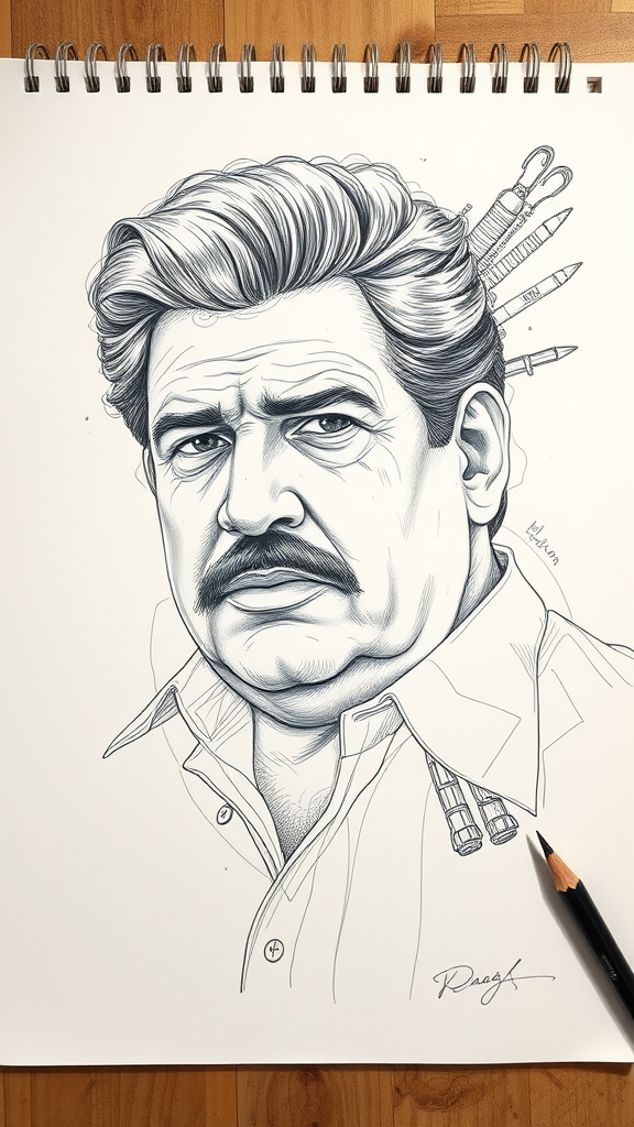 A sketch of Pablo Escobar portrait on paper, centered and intricate, showcasing highly detailed linework with breathtaking beauty. The vibrant and comprehensive piece exudes a cinematic quality reminiscent of Charles Dana Gibson’s style, captured in 8k HDR. The artwork presents intentional imperfections such as text errors, missing or extra digits, and cropped areas, combined with jpeg artifacts and a visible signature. Features include a playful exploration of anatomy with extra limbs, disfigured elements, and objects appearing out of frame. The design incorporates a mix of tiling and artistic distortions, giving the piece a surreal, mutated quality. The sketch is simultaneously gross and captivating, finished with watermarks, simulated artist names, and copyright symbols.