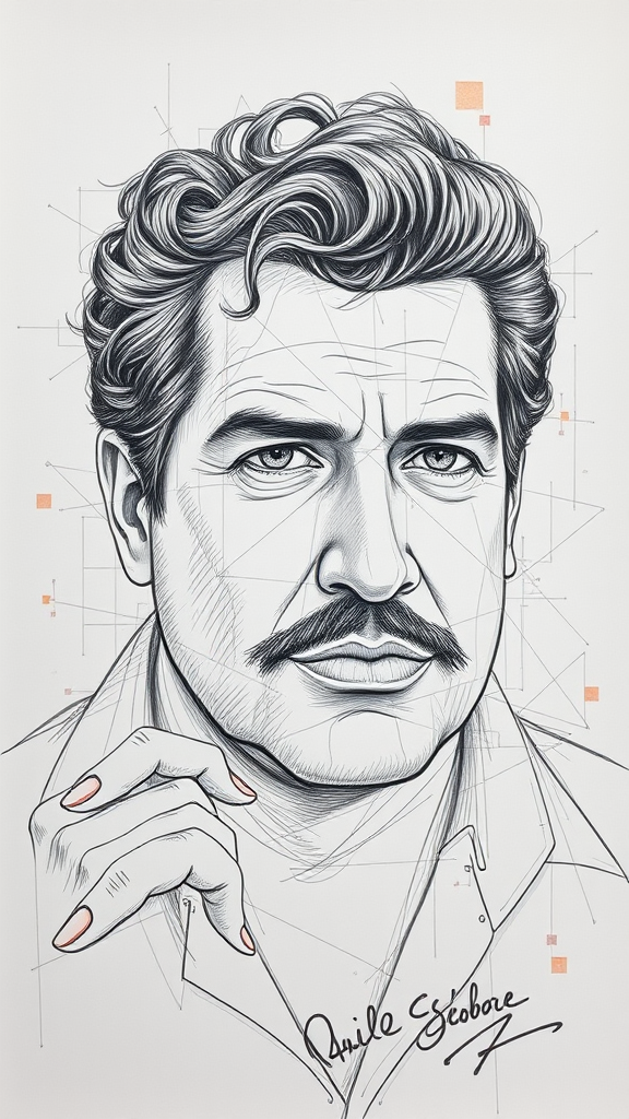 A sketch portrait of Pablo Escobar drawn on paper, centered with intricate details and breathtaking beauty, showcasing precise linework in a vibrant and cinematic style reminiscent of Charles Dana Gibson. The artwork captures the essence of Vice City's aesthetic with an 8k, HDR depth. Despite its allure, the image includes intentional imperfections such as jpeg artifacts and a signature, with elements of distorted anatomy like missing or extra digits, poorly drawn hands, and limbs, creating a surreal, mutated appearance. The portrait is partially cropped, presenting an abstract, tiling effect with areas out of focus, and is adorned with watermarks, both text and artist name, contributing to its unique, artistic distortion.