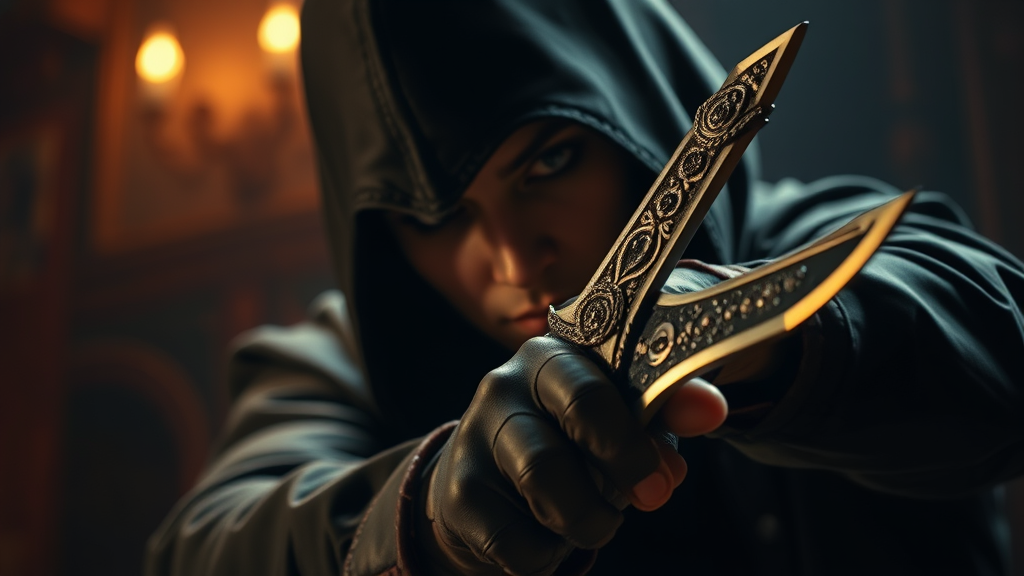 A skilled assassin in a cinematic setting, wielding an intricately designed dagger with precision. The scene captures the atmosphere of a Rutkowski painting, with a focus on the play of light and shadow, creating depth and drama. The details are sharp and vivid, evoking the feel of a carefully edited photograph, accentuated through the depth of field reminiscent of a masterful Lightroom edit.
