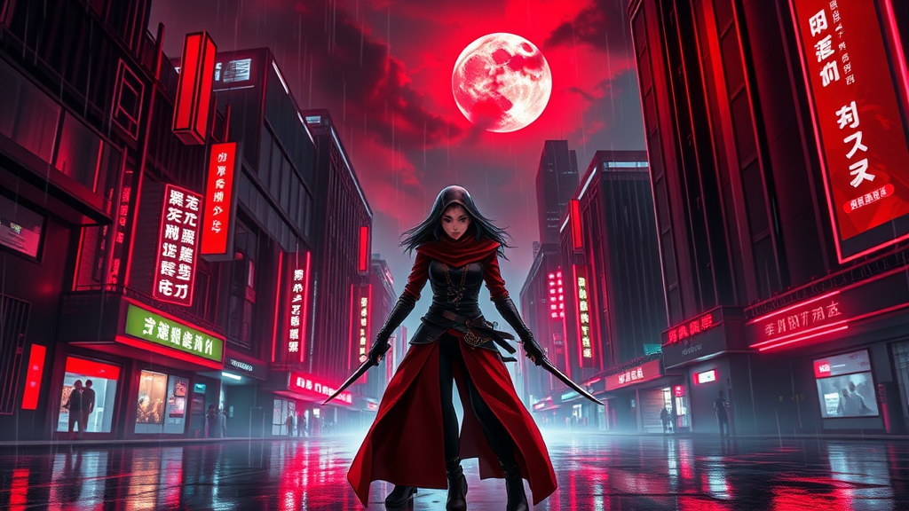 A skilled female assassin ninja dressed in a striking red and black outfit moves stealthily through a futuristic cityscape at night, surrounded by towering black and red buildings. The atmosphere is charged with the electric glow of fluorescent lights, casting vivid reflections on the wet streets. The sky looms with dark foggy clouds, tinged in shades of deep red, while the ominous glow of a red moon peers through, illuminating the scene with an unsettling beauty. Rain falls steadily, creating a rhythmic soundtrack to her movements. This cyberpunk world, reminiscent of anime, bursts with dynamic colors, blending tradition and innovation into a captivating, hybrid art form.