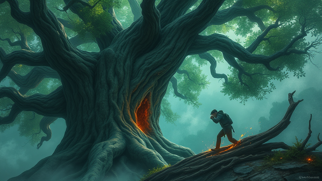 A skilled hacker engaged in a digital battle finds themselves immersed in unexpected conflict with an ancient, mystical tree that guards its secrets fiercely.