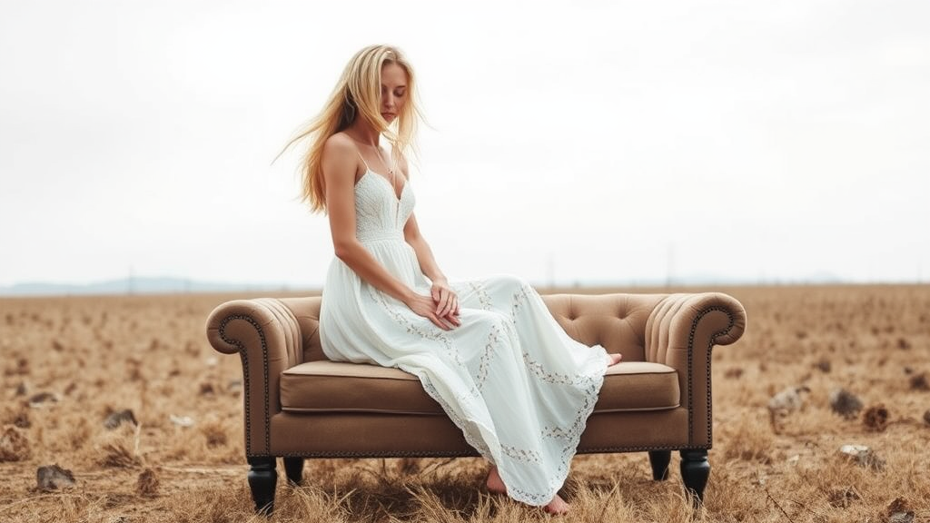 A skinny woman in a white boho dress sits atop a couch in a vast field, reminiscent of Lisa Manobal, with her alluring long blonde hair flowing in the wind. She embodies an ethereal, flowerpunk style with a languid, feral grace. The barren landscape stretches around her, evoking the enigmatic presence of Imogen Poots. Her slender figure blends harmoniously with the desolated backdrop, creating a scene that is both haunting and captivating.