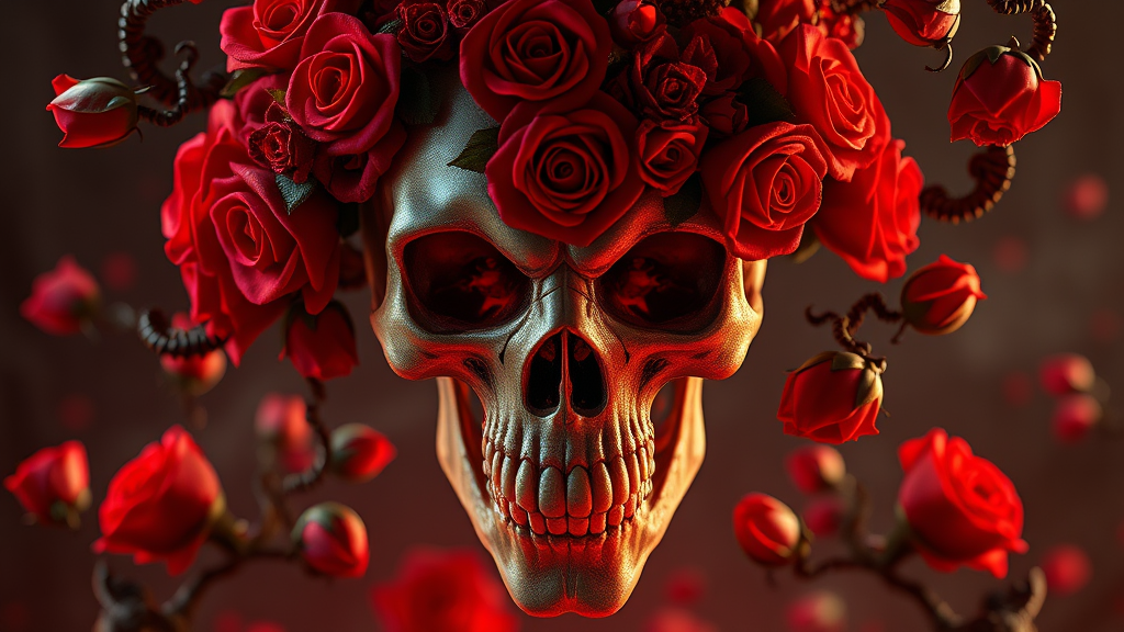 A skull crafted from red roses, embodying organic horror with a devilish undertone, entwining themes of death and inspired by Giger's style. This piece is a fusion of the epic, baroque, and art nouveau styles, reminiscent of James Jean's work. The scene is a photorealistic rendering achieved with 3ds Max and V-Ray, showcasing extreme detail and intricacy with a centered composition. The artwork is both elegant and atmospheric, enhanced by VFX and Unreal Engine 5, utilizing sharp contrasts and lines in a manga-style digital art approach that includes glow effects. The piece is hand-drawn yet rendered in 8k using Cinema 4D, Blender, and Octane Render, delivering a dark cinematic atmosphere with a big depth of field. A hyperrealistic masterpiece, vibrant in color with a model shoot style, inspired by professional oil paintings by Ed Blinkey, Atey Ghailan, and Studio Ghibli, it carries elements of work by Jeremy Mann, Greg Manchess, and Antonio Moro. This concept art is trending on ArtStation and CGSociety, noted for its intricate high detail, dramatic photorealism, and vivid colors—a celebration of sharp focus and creative brilliance.