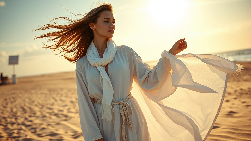 A Slavic 18-year-old model stands majestically on a sunlit sandy beach under expansive open skies, her Slavic features highlighted in a portrait-style composition reminiscent of Issey Miyake's elegance. She is adorned in flowing white robes that dance with the wind, her long hair gently cascading around her. In her hand, she holds a white flag, symbolizing purity and peace, as an unseen energy seems to radiate around her. The setting is vibrantly Cuban, infused with a sense of euphoria and invisible mana in the air. A delicate white scarf adds a touch of hyper-feminine grace to the scene, as this promotional shot captures a moment of serene beauty and empowerment, reminiscent of a timeless celebration of spirit and nature.