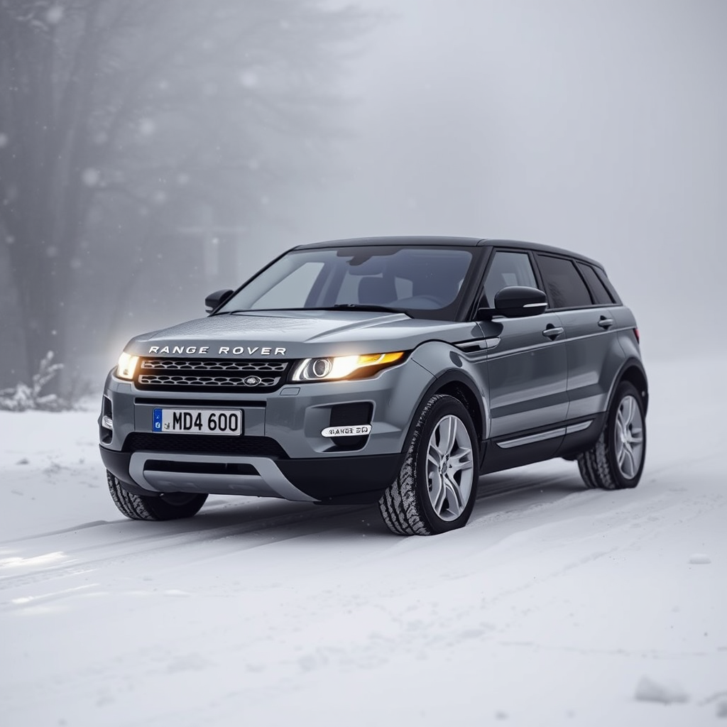 A sleek 2012 model gray Range Rover Evoque with the license plate 34 MDA 600 glides smoothly down a snowy path under a haunting atmosphere. Its striking single-door design gleams with a polished finish, enhanced for high gloss that captures the reflection of surroundings. The headlights pierce through an enveloping fog, creating an eerie yet captivating scene reminiscent of an Artgerm illustration. Encapsulating a sense of hygge amid the cold, with soft, diffused lighting adding a cozy contrast to the chilling environment.