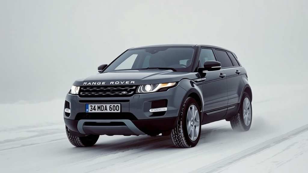 A sleek 2012 model grey Range Rover Evoque, with the license plate 34 MDA 600, navigates a snowy, desolate road. Its solitary, striking single-door design is accentuated by the gleaming headlights that pierce through the dense fog. The vehicle's polished surface shines with a high gloss, reflecting the surrounding eerie landscape. An unsettling yet captivating atmosphere envelops the scene, merging a sense of artful tension akin to an Artgerm illustration with the cozy, comforting vibes of hygge. The dance of shadows and muted light creates an intriguing harmony between the vehicle's modern elegance and the mysterious, mist-laden backdrop.
