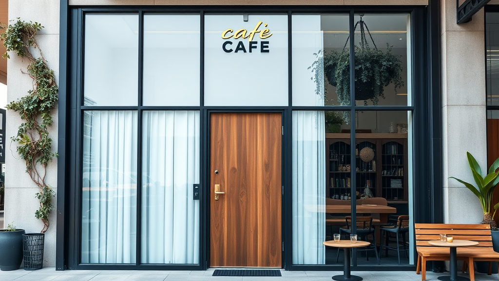 A sleek and contemporary cafe facade featuring large floor-to-ceiling glass windows framed in matte black steel, allowing ample natural light to flood the interior and creating a seamless connection with the outside. The entrance is marked by a minimalist wooden door with a discreet, polished brass handle. Above, a simple, elegant signboard displays the cafe's name in bold, sans-serif letters. The facade is complemented by a subtle, vertical garden on one side, adding a touch of greenery that contrasts with the clean lines of the structure. Understated outdoor seating includes wooden benches and small, round tables, inviting patrons to enjoy the atmosphere in a relaxed, open space.