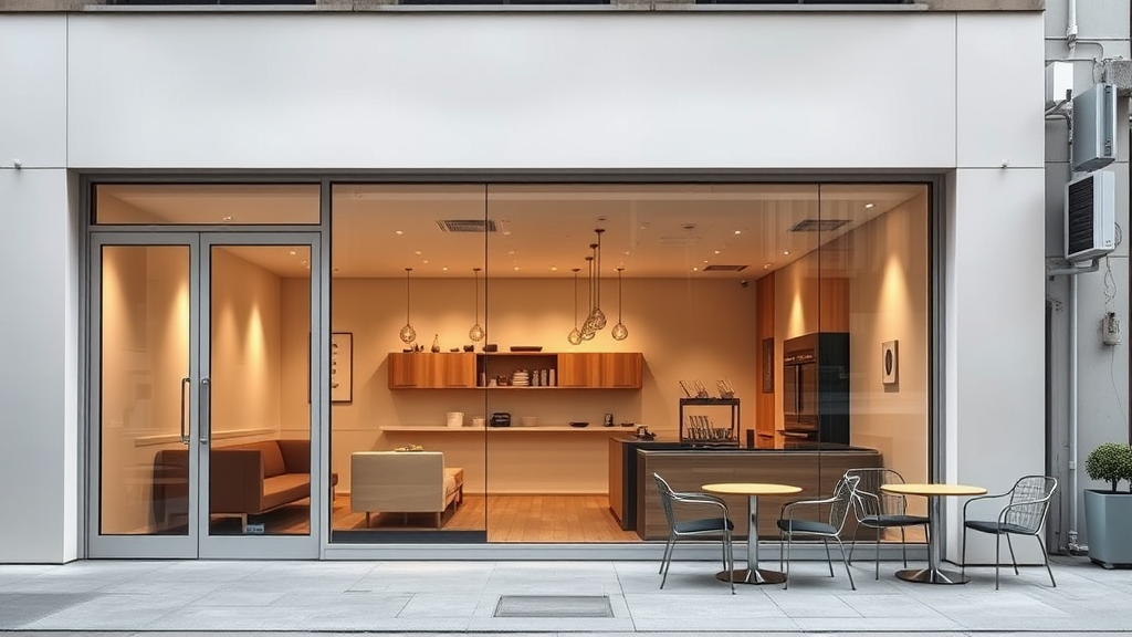 A sleek and contemporary cafe store front featuring clean lines and large glass windows, showcasing a minimalist interior with a few carefully chosen modernist furnishings; the facade is painted in subtle neutral tones that emphasize the simplicity of the design, while a stylish outdoor seating area with minimalist chairs and tables invites patrons to relax; the overall image is crisp and detailed, capturing the essence of modernism and minimalism with a touch of urban sophistication.