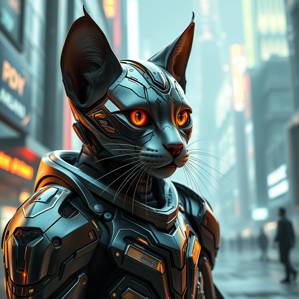 A sleek and detailed sci-fi armored feline, set in a futuristic cityscape, gleaming under neon lights, showcasing an intricate design with advanced metallic plating and enhanced cybernetic features, capturing every detail in stunning 4k resolution.