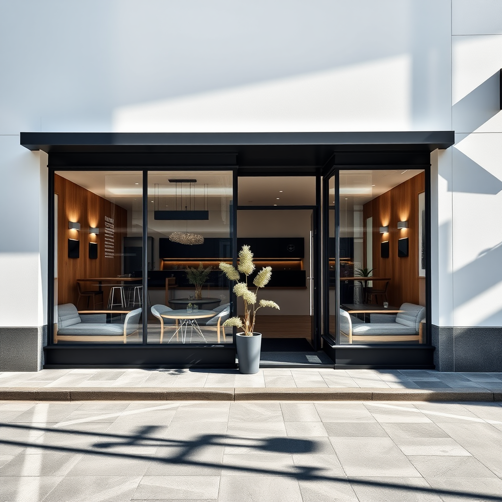 A sleek and minimalist cafe storefront exudes modernism with its large glass windows and simple geometric lines. The clean architecture features a monochrome color scheme, with accents of natural wood that add warmth to the design. Inside, glimpses of streamlined furniture can be seen, inviting patrons to relax in a chic yet unpretentious atmosphere. The entrance is adorned with a single ornate plant that adds a touch of natural beauty to the contemporary scene. Crisp shadows and reflections play across the polished pavement, creating a sharp and vibrant overall image.