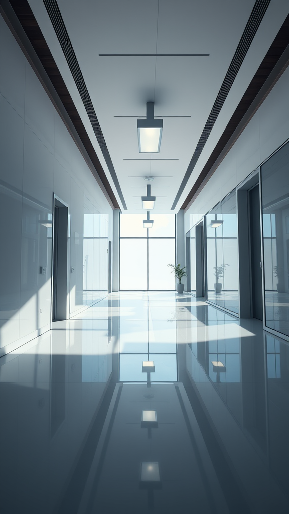 A sleek and minimalist office interior captured from a front view, utilizing a Sony A7R IV with an 85mm lens. The scene exudes contemporary style with a high gloss finish and is bathed in the soft, cool-toned lighting of a bright afternoon sun. Modern light fixtures cast gentle glows, enhancing the tranquil yet professional atmosphere, while subtle shadows add depth and contrast to the clean lines and uncluttered surfaces.