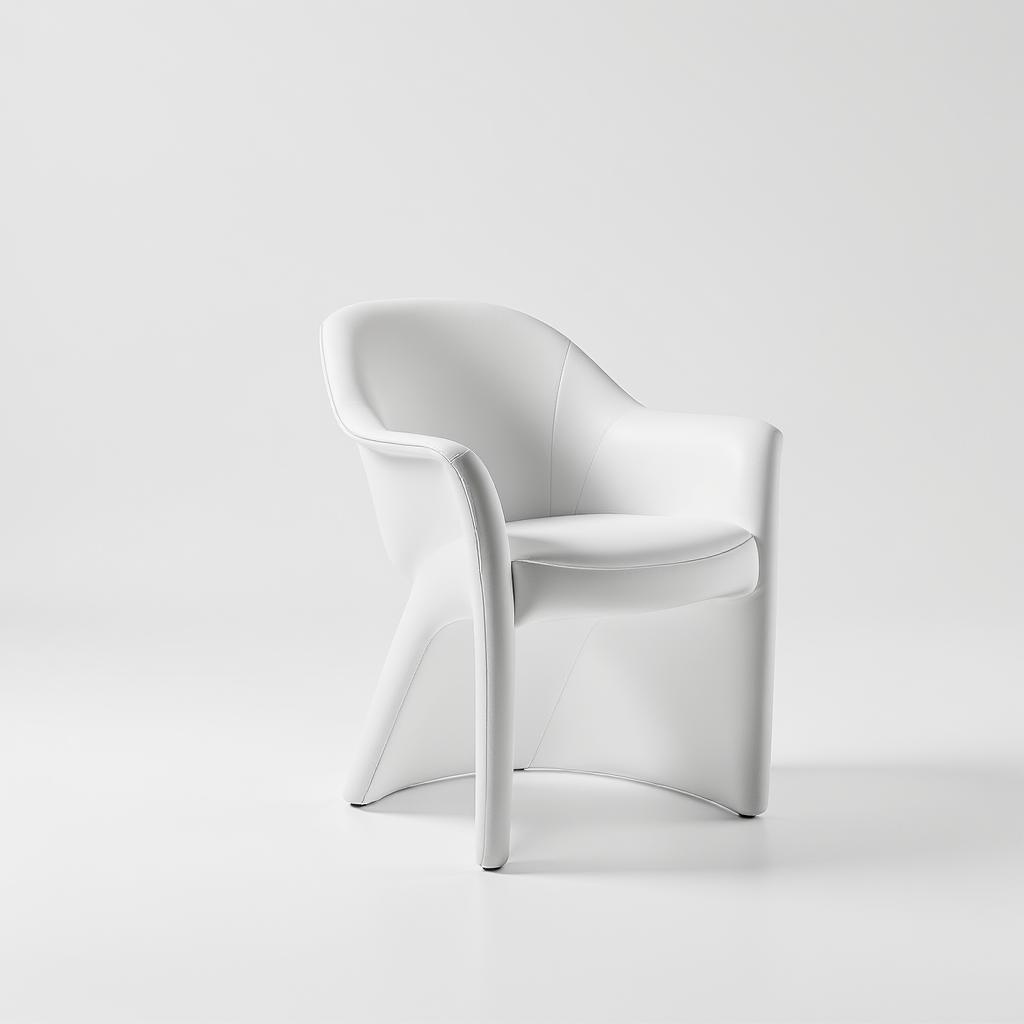 A sleek and minimalistic chair sits gracefully in a pristine white studio setting, its elegant contours captured through a Hasselblad X1D II 50C with a 90mm lens, highlighting the chair's refined texture and intricate stitching that add subtle sophistication.
