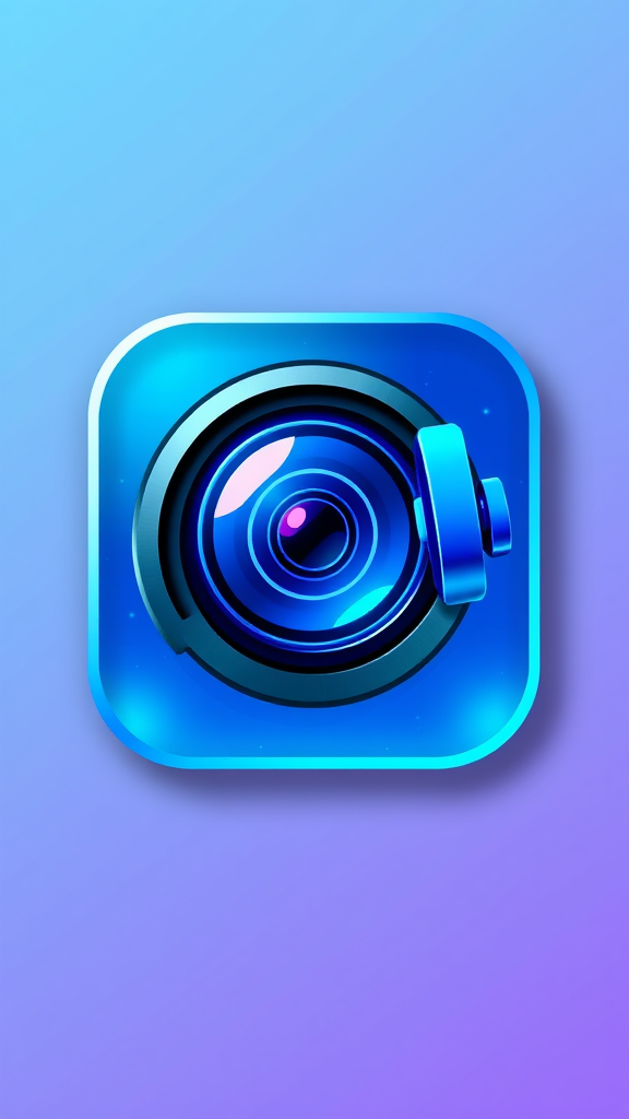 A sleek and modern app icon featuring a stylized camera lens integrated with a dumbbell, symbolizing the fusion of photography and fitness, designed in a captivating blue color palette with gradients reflecting energy and movement.