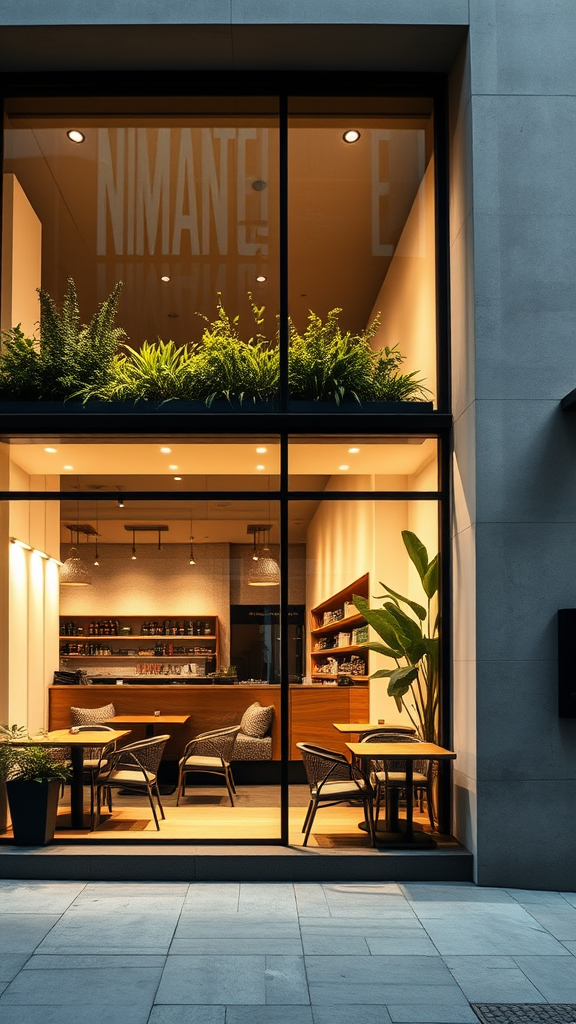 A sleek and modern cafe storefront featuring large glass windows that reflect the soft glow of interior lighting, minimalist architectural elements highlighted by clean lines and neutral tones, stylishly arranged chairs and wooden tables visible through the glass, an inviting atmosphere with lush greenery subtly integrated into the design, the overall aesthetic sharp, sophisticated, and effortlessly merging urban elegance with simple natural elements.