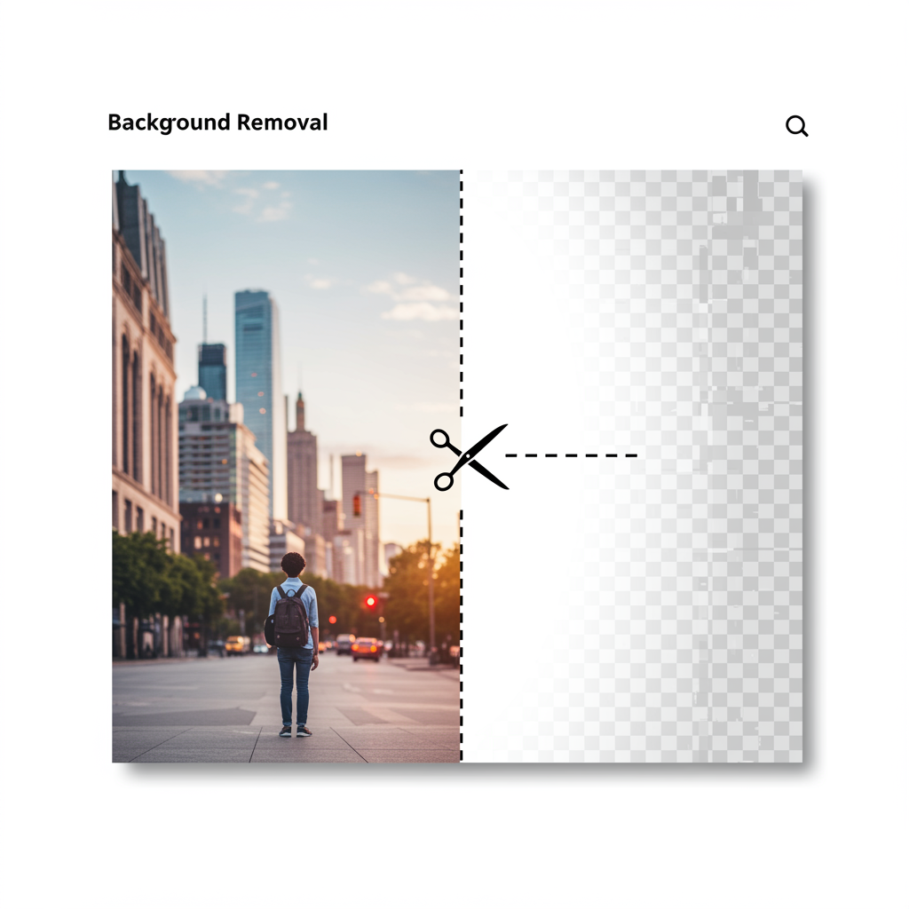 A sleek and modern landscape-format banner depicting a background removal concept. On the left side, a vibrant, high-resolution photo of a person stands amid a bustling urban environment, capturing the essence of dynamic city life. The right side transforms into a transparent checkerboard pattern, symbolizing the background's removal. A stylized scissor icon or a dotted cut line crisply divides the two sections. The visual style is minimalistic and tech-oriented, featuring soft lighting and pastel hues. The composition highlights clarity and contrast, presenting a polished design suited for a website or product interface.
