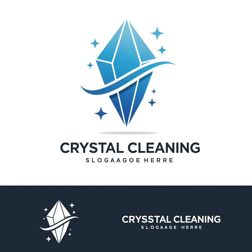 A sleek and modern vector logo for Crystal Cleaning featuring a stylized, shimmering crystal icon integrated with gentle, sweeping curves that evoke a sense of purity and cleanliness; the logo should include a fresh blue and white color palette to convey a feeling of freshness and trust, with the company name artistically incorporated in a clean, elegant sans-serif font.