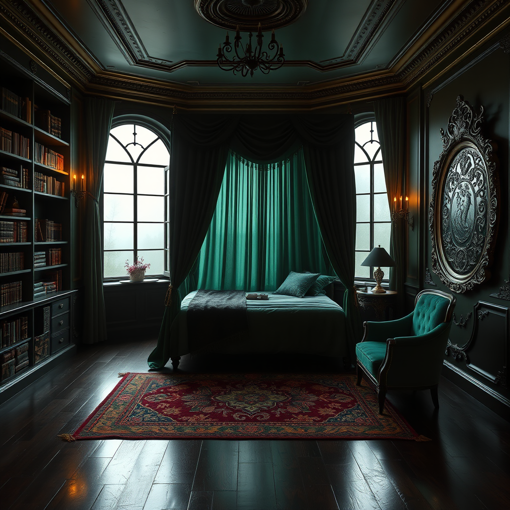 A sleek and mysterious bedroom with deep emerald green walls and dark, polished wooden floors, featuring rich silver accents throughout. The canopy bed, draped with luxurious emerald and black silk curtains, stands as the focal point amidst shelves lined with leather-bound books and curious artifacts. Dimly lit by ornate, wrought iron sconces, the room is furnished with a plush velvet armchair and a large antique mirror with intricate serpentine designs etched into its frame. The atmosphere is one of sophistication and power, with subtle hints of magic and intrigue woven into the decorative patterns of the plush rugs and heavy damask drapes that frame tall, arched windows overlooking a misty landscape.
