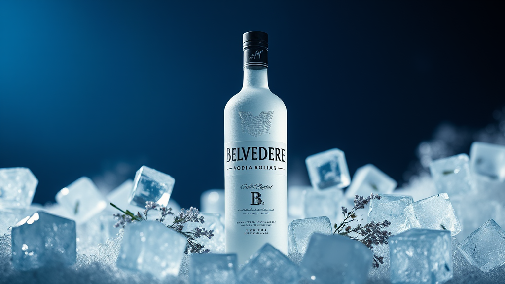 A sleek and sophisticated ad campaign for Belvedere Vodka, capturing the elegance and purity of the product. The photo showcases the iconic frosted bottle, elegantly lit to highlight its smooth curves and luxurious feel. Surrounding the bottle is an artful blend of shimmering ice cubes and delicate botanicals, softly out of focus, evoking a sense of refinement and craft. The background is a gradient of midnight blue fading into silvery white, enhancing the vodka’s pristine image. The composition, with a 3:4 aspect ratio, creates a harmonious balance, inviting viewers to experience the essence of timeless luxury with a touch of modernity.
