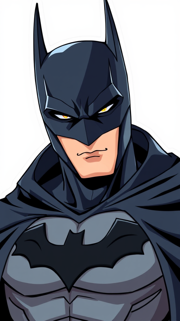 A sleek anime-inspired sticker of Batman with a subtle smirk, featuring minimalist design elements, characterized by sharp lines and a limited color palette, resonating with the latest trends seen on ArtStation, capturing a sense of mystery and charm.