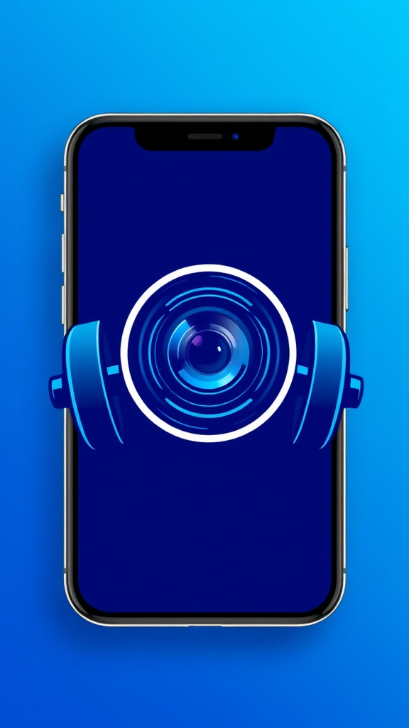 "A sleek app icon featuring a stylized camera lens intertwined with a barbell, set against a dynamic blue color palette, embodying the fusion of photography and fitness in a modern gym app design."
