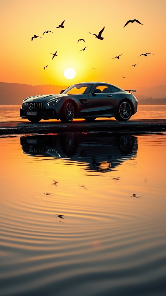 A sleek Benz AMG GT glides along the shimmering edge of a tranquil lake, its powerful silhouette mirrored perfectly in the water below. The sun sets behind it, casting a warm golden hue across the scene, and the car's reflex on the glassy surface appears almost ethereal, as if the liquid itself is imbued with the carβs elegance. Ripples from a gentle breeze distort the reflection slightly, creating an abstract impression of speed and grace, while birds flutter overhead, their shadows dancing across the vibrant scene.