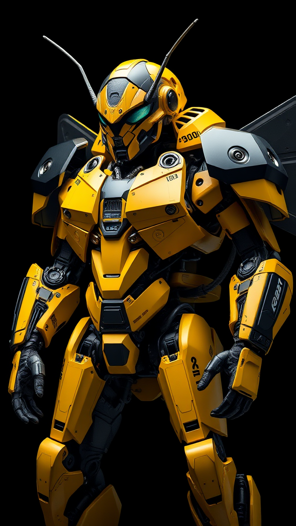 A sleek black and yellow battle mech stands ready, its design marked by intricate details and sharp contrasts. It features a stunning sci-fi mask with reflective surfaces that accentuate its yellow body. The mech is equipped with a powerful jetpack, underscoring its insectoid appearance and purpose-built for combat. Bright yellow polymer armor elements with unique identifiers add to its distinct look, while natural textures and reflections enhance its lifelike presence. Set against a black background, the mech is bathed in eerie, dramatic lighting that highlights its formidable design in ultra-high resolution. The detailed armor reveals its innards, offering a glimpse of the advanced technology within. The scene is captured in a photorealistic, hyper-realistic style with cinematic shooting techniques. The composition is crisp and vibrant, with every fine detail meticulously rendered in 8k UHD clarity.