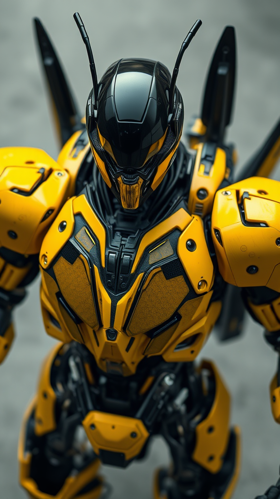 A sleek black and yellow battle mech, stunningly detailed with a high-tech sci-fi mask and reflective yellow body panels, equipped with a sophisticated jetpack. Taking inspiration from insectoid designs, this sci-fi combat mech showcases intricate detailing, featuring vibrant yellow polymer armor with distinctive markings and intricate mechanical innards. The textures and natural reflections create an eerie yet captivating appearance, set against a dramatic backdrop. The composition is expertly staged from a top-down view, employing Rembrandt lighting to emphasize the mech's striking features. This scene captures a photorealistic and hyper-realistic quality in 8k UHD, with no distractions from the neutral, blurred background that allows the mech to truly stand out in cinematic splendor.