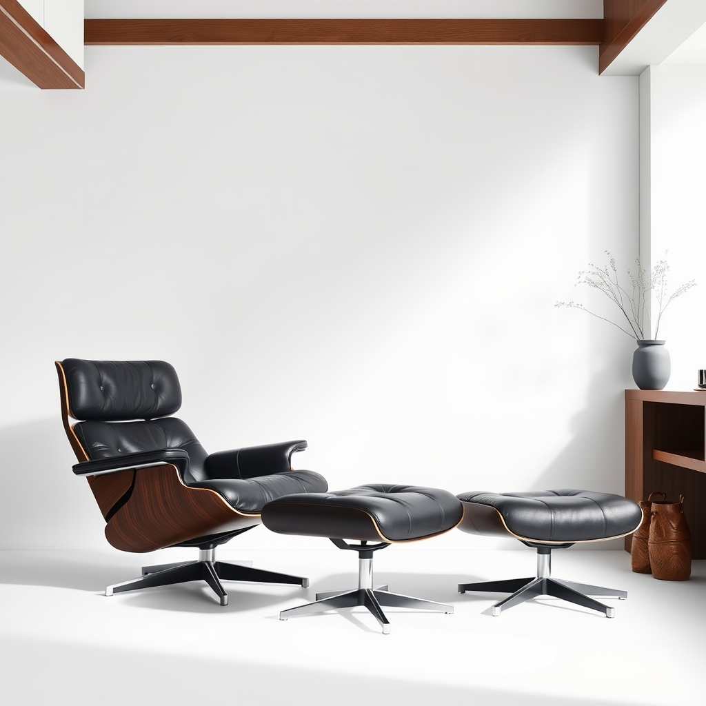 A sleek black leather lounge chair and ottoman set against a pristine white background, inspired by a portrait style reminiscent of Yi Jaegwan, exuding modernist elegance. With the essence of sophisticated style, this scene is enhanced by the rich texture of interior wood elements, embodying a sense of deluxe comfort and refined simplicity.