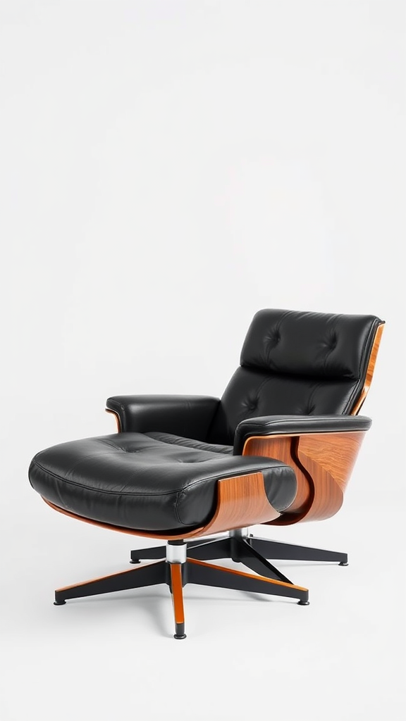 A sleek black leather lounge chair paired with a matching ottoman set against a pristine white backdrop, influenced by the portrait style of Yi Jaegwan, exuding modernist elegance. The piece features a sophisticated blend of premium wood accents, emphasizing a sense of deluxe comfort and style.