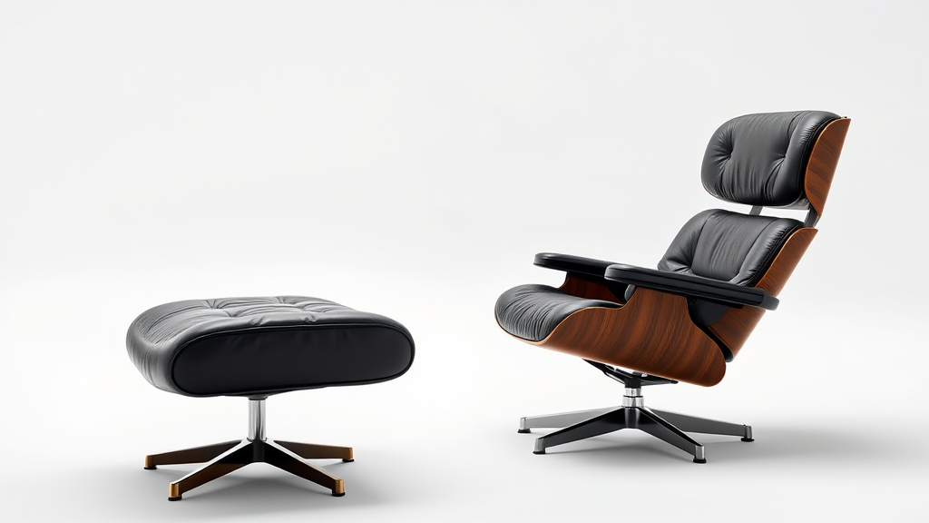 A sleek black leather recliner and matching ottoman set against a minimalist white backdrop, capturing the essence of a portrait by Yi Jaegwan, infused with modernist design elements. Featuring elegant wooden accents, the composition exudes a sophisticated and deluxe ambiance, heightened by its stylish and contemporary aesthetic.