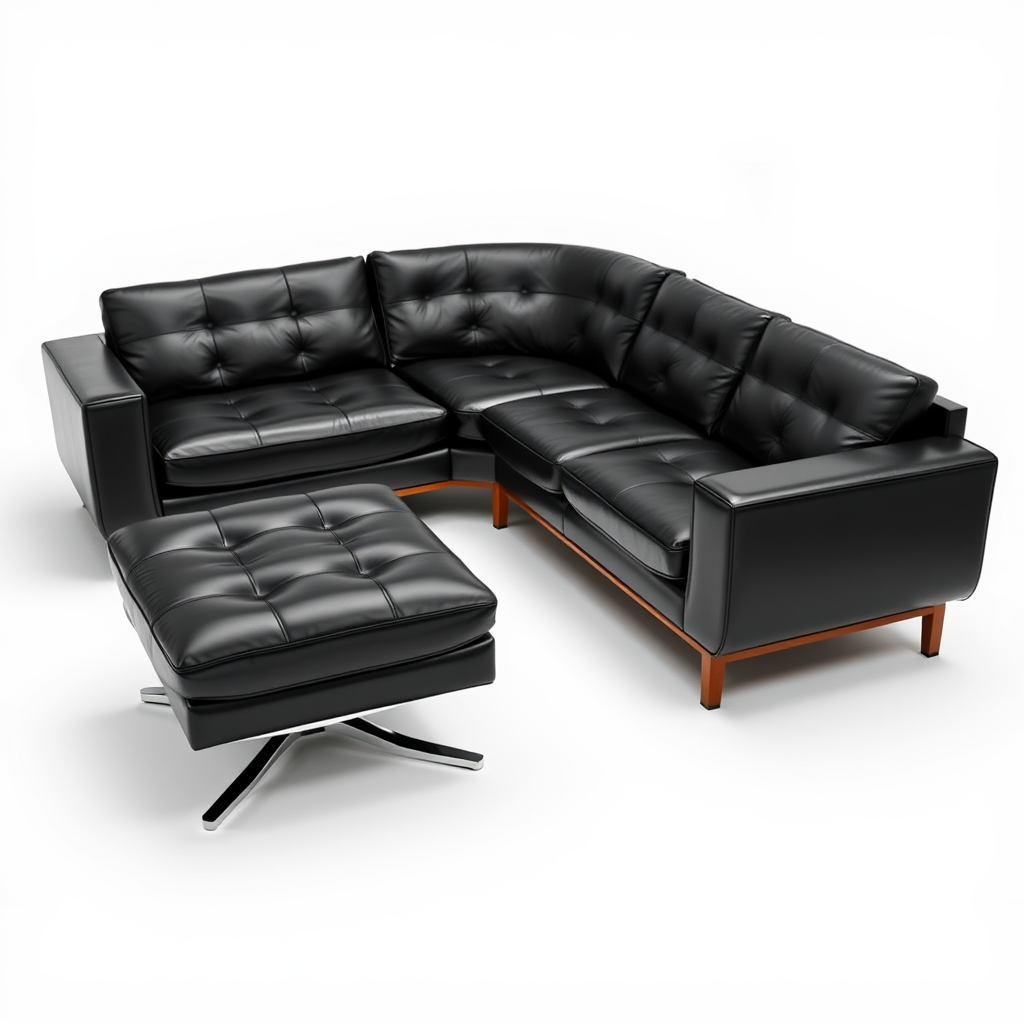 A sleek black leather sectional with matching ottoman on a pristine white backdrop, reminiscent of a portrait by Yi Jaegwan, embracing modernism, featuring 5 elegant features, dimensions h 6 4 0, complemented by rich wood accents, luxury style --q 2 --v 5.