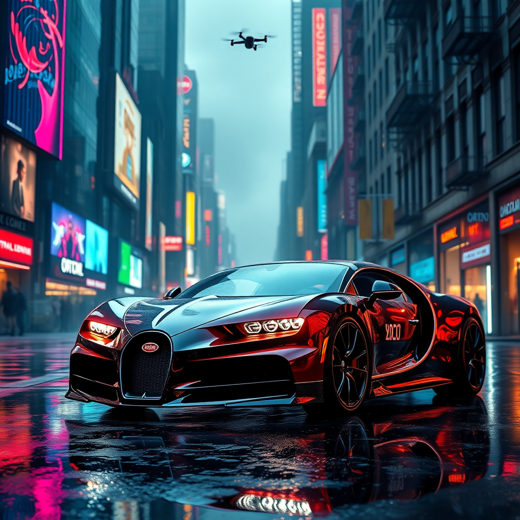 A sleek Bugatti Chiron idles in the heart of a futuristic metropolis, its glossy surface reflecting the vibrant neon hues and electric ambiance of the cyberpunk cityscape surrounding it. Pulsating holograms dance across nearby skyscrapers, casting a luminous glow over the car's aerodynamic curves. The rain-slicked streets shimmer with a kaleidoscope of colors as digital billboards flicker overhead, while drones buzz quietly in the misty air, adding to the city's symphony of technology and wonder. The Chiron's headlights pierce through the urban haze, illuminating the intricate web of alleys and towering structures, embodying a blend of luxury and cutting-edge innovation amidst the city's relentless energy.
