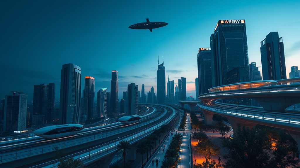 A sleek cityscape of towering skyscrapers with luminous facades and interconnected sky bridges, under a twilight sky in hues of deep blue and silver. Gleaming autonomous vehicles glide silently along elevated tracks, while pedestrians move through tree-lined walkways illuminated by soft, ambient light. In the sky above, a streamlined spaceship with smooth curves and a reflective surface glides effortlessly, leaving a faint trail of gentle luminescence. The entire scene is rendered in a minimalist style with clean lines and geometric shapes, utilizing a limited palette of blues, silvers, and soft whites to evoke a sense of futuristic tranquility and innovation.