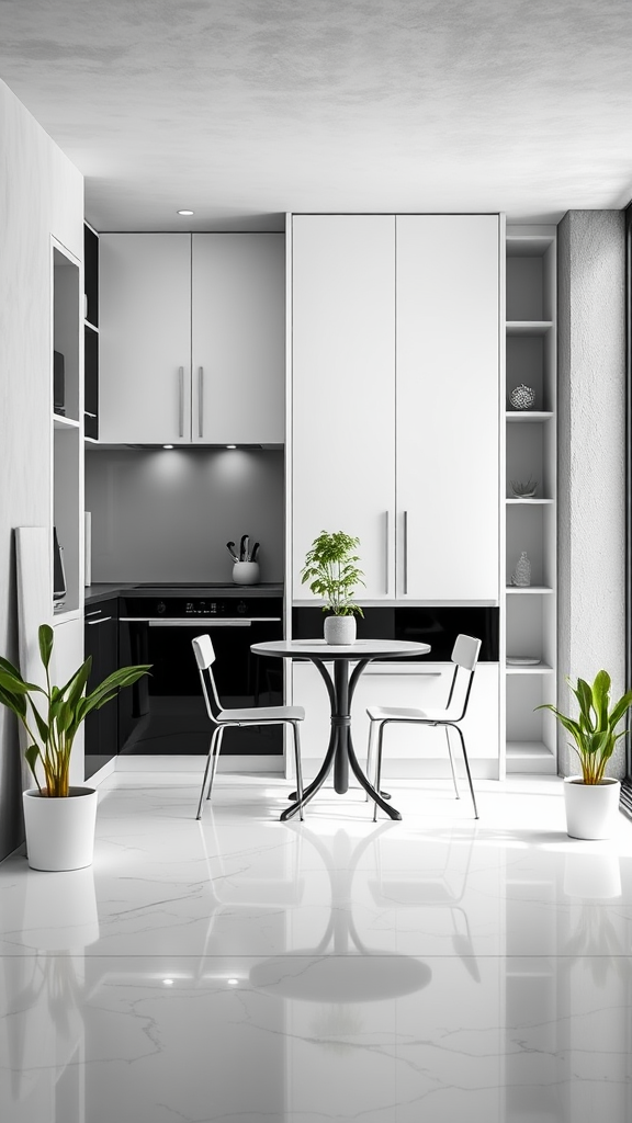 A sleek, compact kitchen features a monochrome theme with a streamlined black and white kitchen set that contrasts elegantly against the polished white marble floor. The walls are coated in a soft, textured gray plaster, creating a calming backdrop. A petite table and matching chairs serve as the dining area, their minimalist design enhancing the modern aesthetic. Lush green plants in minimalist pots are strategically placed, bringing a touch of nature and vibrancy to the space. The overall design embodies a hi-tech, minimalist style, with clever storage solutions and integrated smart appliances subtly incorporated to maintain a clean and clutter-free environment.