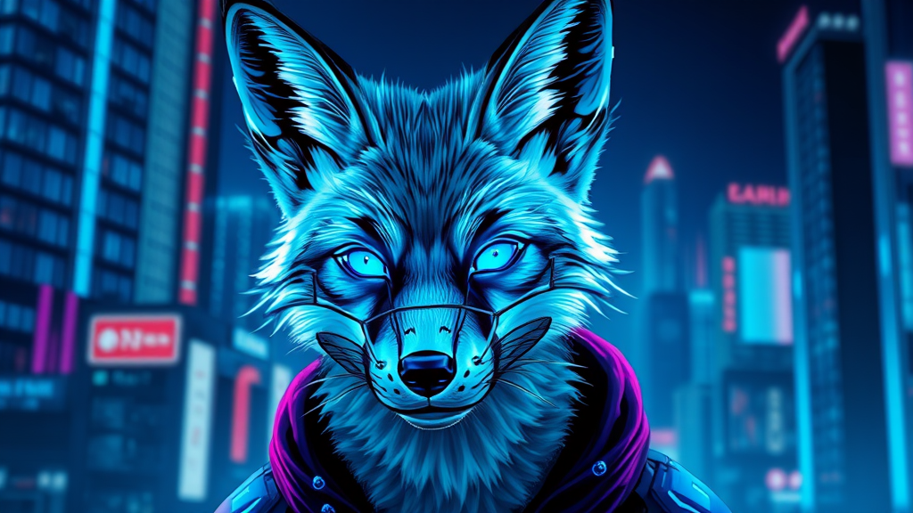 A sleek cybernetic fox with luminescent fur, its eyes glowing with an electric blue hue, dons a shimmering metallic mask over its mouth, blending seamlessly into the backdrop of a high-tech neon cityscape. Its ears twitch subtly as if tuning into the digital frequencies of its surroundings, while tiny digital patterns ripple across its fur, adding an enigmatic allure to its presence.