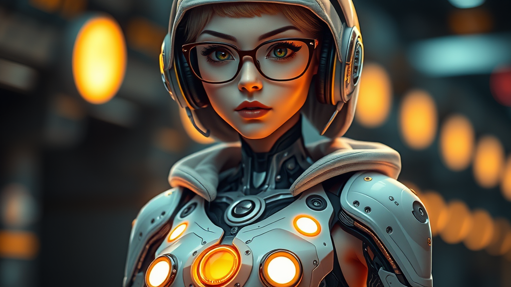 A sleek cyborg girl with a futuristic aesthetic showcases her mechanical elements. Her design features gloss and depth of field, with super detailed, cinematic, cyberpunk lighting emphasizing her form. Equipped with glasses, a stylish headdress, and headphones, she presents a dynamic look. Her figure is characterized by a flat chest, skinny build, and narrow hips, accentuated by glowing details on her chest and piercing eyes. A hood frames her face, while her bare neck adds to her modern appearance. Light radiates brightly from her torso, casting a golden hue across her features. The intricate design includes rivets and seamless integration of technology. Her folded posture reflects an intriguing complexity, accompanied by artistic elements like round windows and circular details. Her expression, both enigmatic and lively, captures the essence of a cybernetic being. Despite the sophisticated design, the overall portrayal maintains clarity and precision, avoiding any flaws or distortions in anatomy.