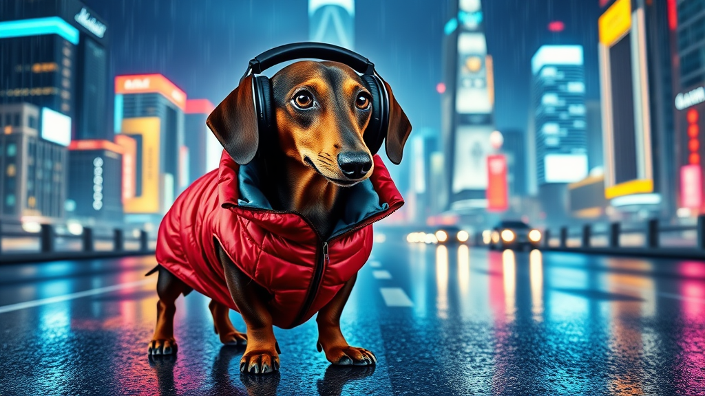 A sleek dachshund dog with one eye a striking blue and the other a warm brown, sporting oversized Marshall headphones and a vibrant red down jacket, stands poised on a slick road. The backdrop is a futuristic cityscape, shimmering and alive under the rain, illuminated by neon lights reflecting off wet surfaces. The city's towering, translucent structures and hovering vehicles form a dazzling, ultramodern skyline, contrasting with the dog's confident and inquisitive stance.