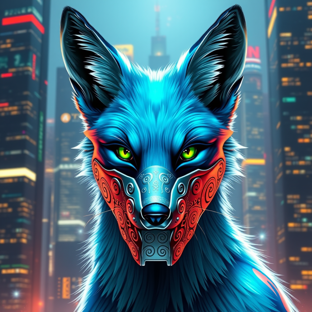 A sleek, digital fox with luminous blue fur and piercing green eyes, wearing an intricately designed silver mask that covers its mouth, adorned with swirling patterns reminiscent of ancient runes. In the background, a shimmering cityscape of towering neon skyscrapers casts vibrant reflections on the fox's glossy coat, hinting at a world that blends nature and technology harmoniously. The fox's expression conveys wisdom and mystery, while subtle holographic elements dance around its silhouette, adding an ethereal quality to the scene.