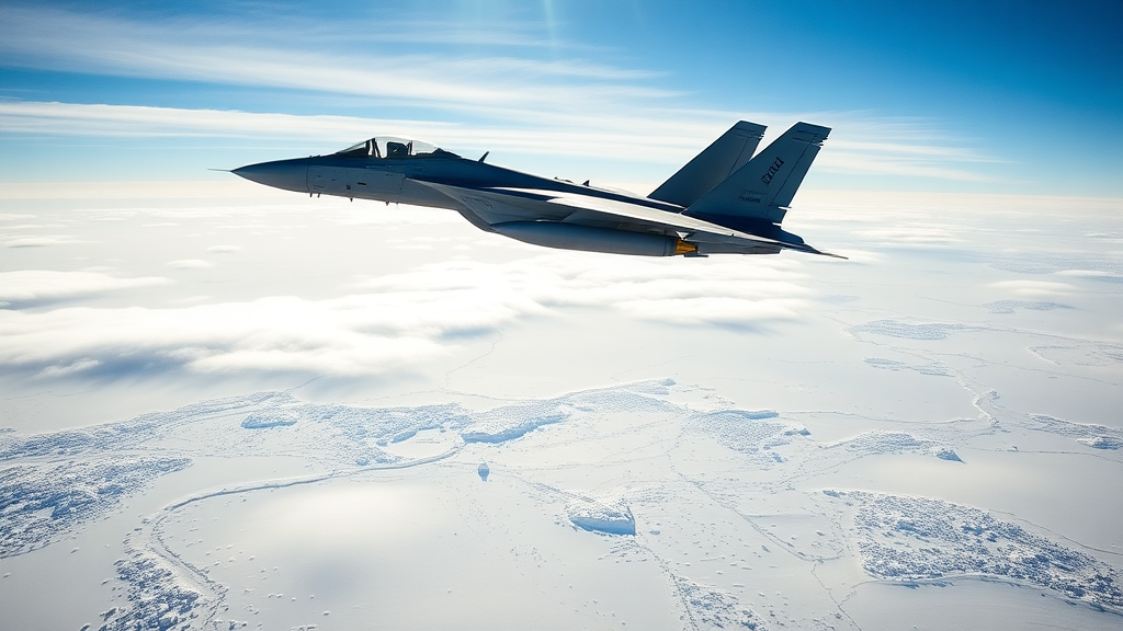 A sleek F-15S/MTD soars over a vast tundra landscape, its engines roaring against the backdrop of the crisp, azure sky. Below, endless stretches of snow-covered ground glisten under the pale sunlight, dotted with sporadic patches of resilient vegetation that bravely break through the icy surface. The aircraft's wingtips carve through wisps of low-lying clouds, leaving a fleeting trail of vapor in its wake. As it banks smoothly to one side, the reflection of the aurora borealis dances across its polished fuselage, a testament to the merging of advanced engineering with nature's breathtaking tranquility.