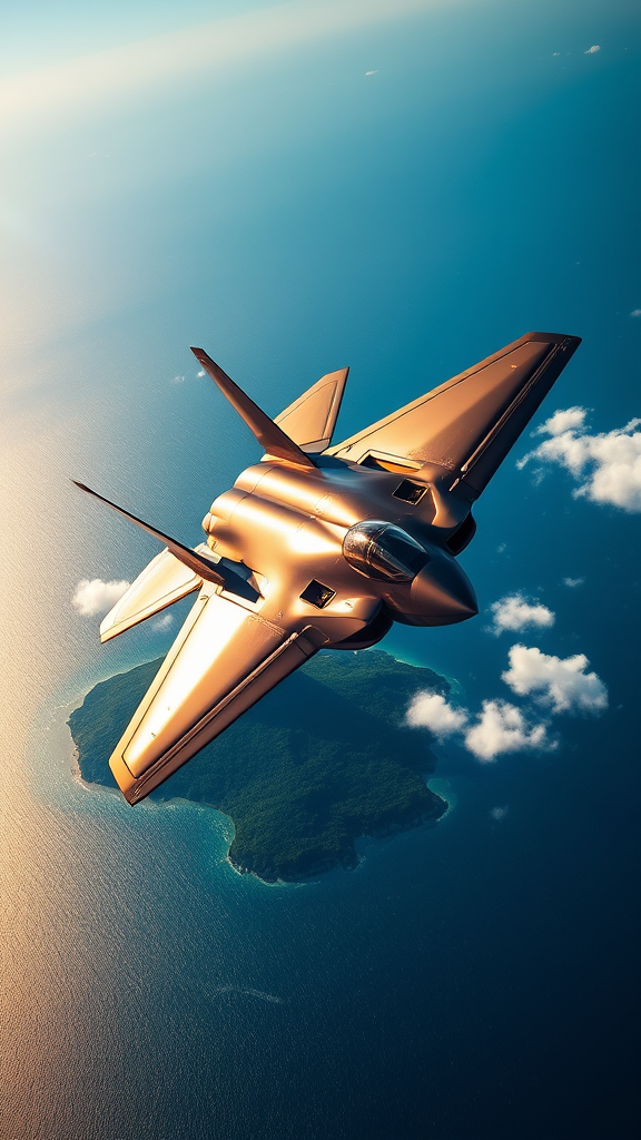 A sleek F-22 Raptor soars effortlessly through the azure sky, its metallic surface reflecting the golden hues of the setting sun as it streaks over a lush, verdant island, surrounded by the shimmering expanse of the deep blue ocean. Pale clouds drift lazily nearby, their wispy forms creating an ethereal backdrop to the scene of technological prowess meeting untamed natural beauty.
