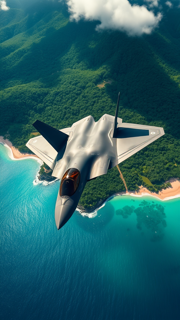 A sleek F-22 Raptor soars gracefully over a lush, emerald island, its shadow racing across the vibrant landscape below. The sun glints off its metallic surface as it cuts through the sky, while the island's dense jungle and sparkling beaches provide a stunning backdrop. The roar of the engines mingles with the sound of ocean waves, creating a symphony of nature and technology.