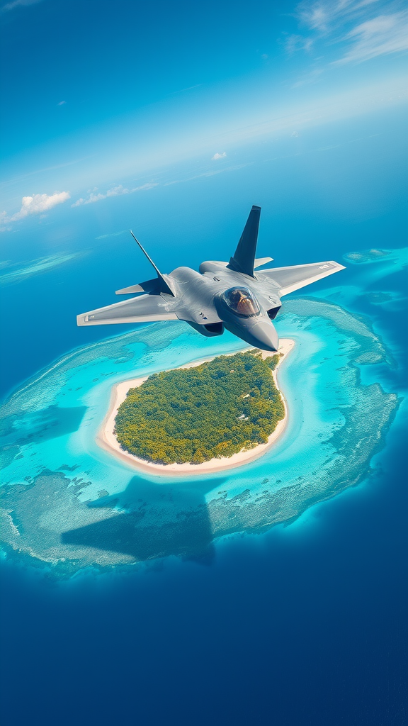 A sleek F-22 Raptor soars majestically in the azure sky, casting a shadow over a lush, tropical island surrounded by crystal-clear turquoise waters, its engines roaring softly as it glides effortlessly above the vibrant green canopy dotted with bursts of colorful flora.
